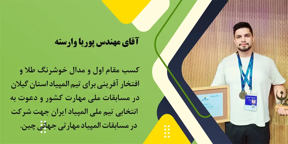 وارسته 0 نظر گالری تصاویر آبان 5, 1404 05 آبان 1404 کسب مقام اول تیم المپیاد استان گیلان آموزشگاه فنی و حرفه ای بوستانآقای مهندس پوریا وارستهکسب مقام اول و مدال خوشرنگ طلا و افتخار آفرینی برای تیم المپیاد استان گیلان در مساب... ادامه مطلب